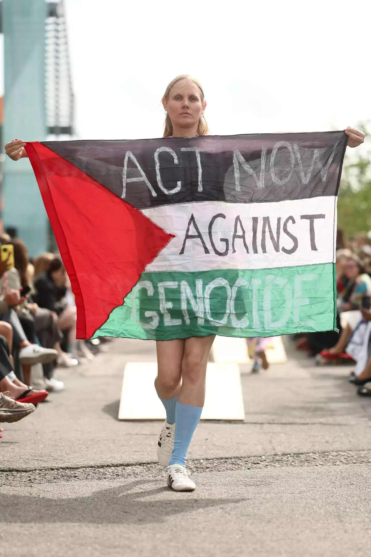 Marimekko during Copenhagen Fashion Week, model and musician Jura carried a Palestinian flag on the runway, with the message “Act now to stop Genocide.” The keffiyeh also made appearances in skirts, scarves, and dresses, an explicit gesture of solidarity with Gaza.