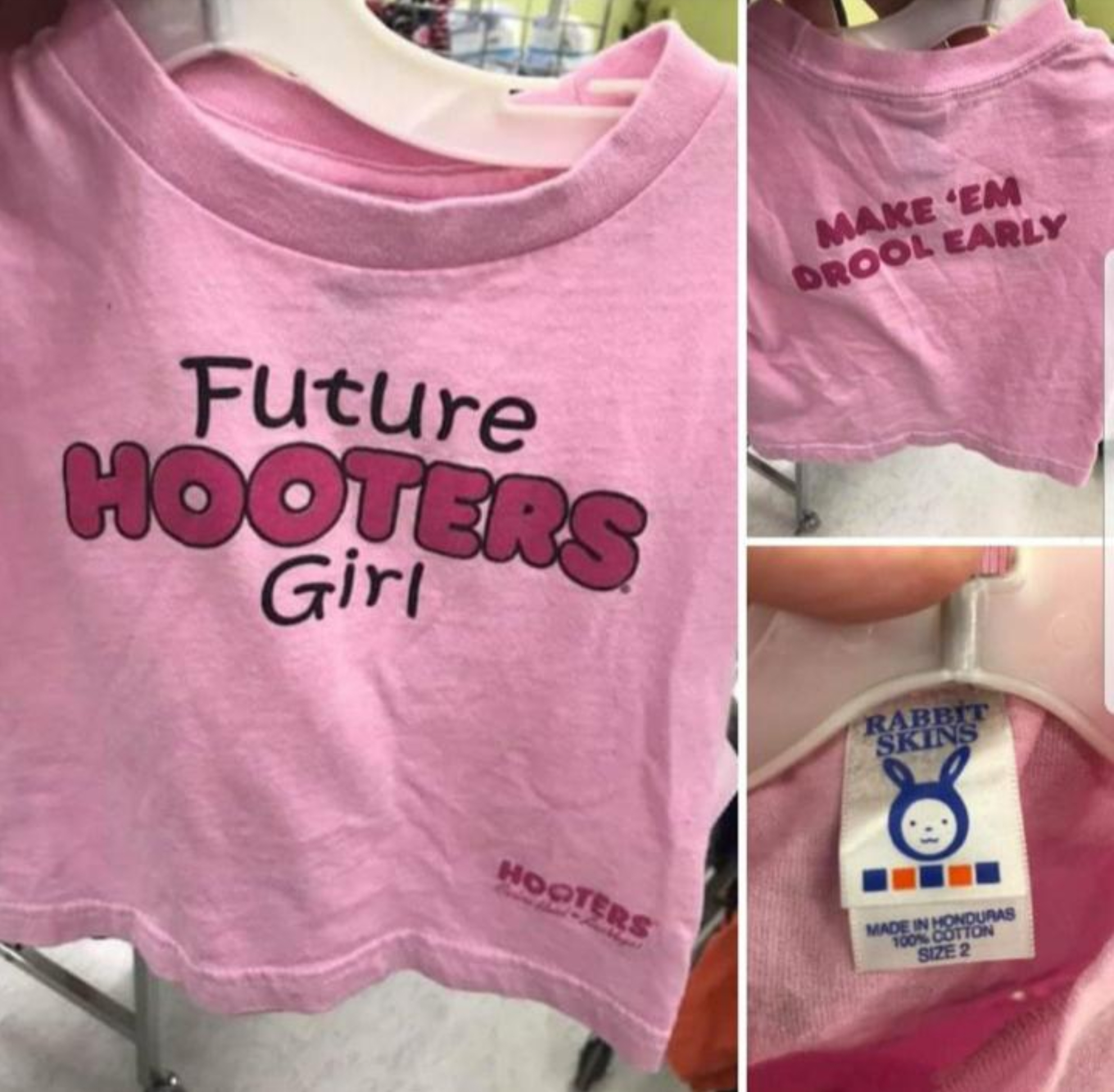 Every so often, a retailer releases a “quirky” children’s graphic tee that slips straight into adult suggestiveness. Printed slogans like “Lock Up Your Daughters” or “Does this diaper make my butt look big”. Going so far as to even have shirts that say "Future Hooters girl" with the print "Make 'em drool early" plastered on the back, hanging in the toddlers section. They’re meant to be jokes, but they feed the same cycle of early sexualisation and gender scripting.