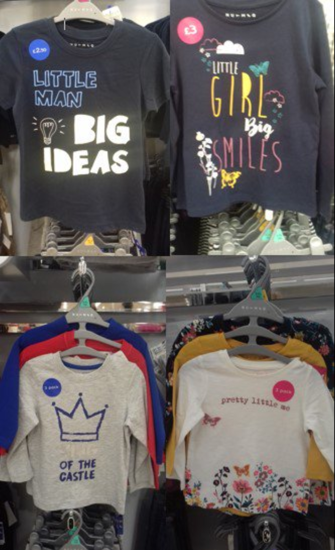 Even when children’s clothes aren’t overtly sexualised, they still carry heavy gender messaging. Boys t-shirts say “Future CEO,” or “Trouble Maker,” or “Adventure Squad.” Meanwhile girls T-shirts say “Born to Sparkle,” or “Be Pretty,” or worse, “Too Cute for Homework.”